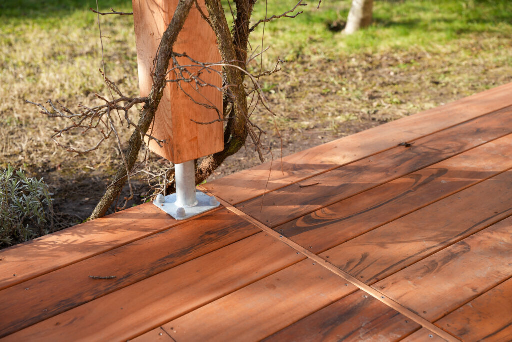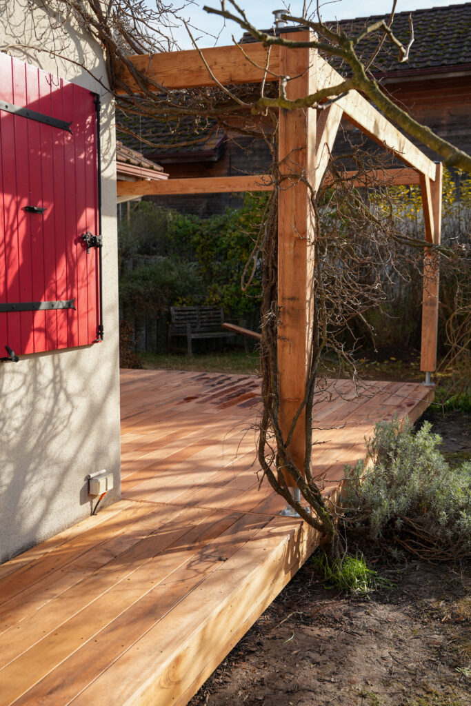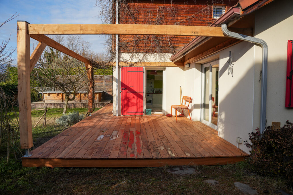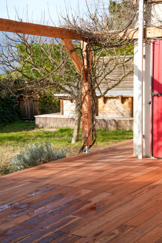Rénovation d’une terrasse en Muiracatiara avec conservation des végétaux existants.